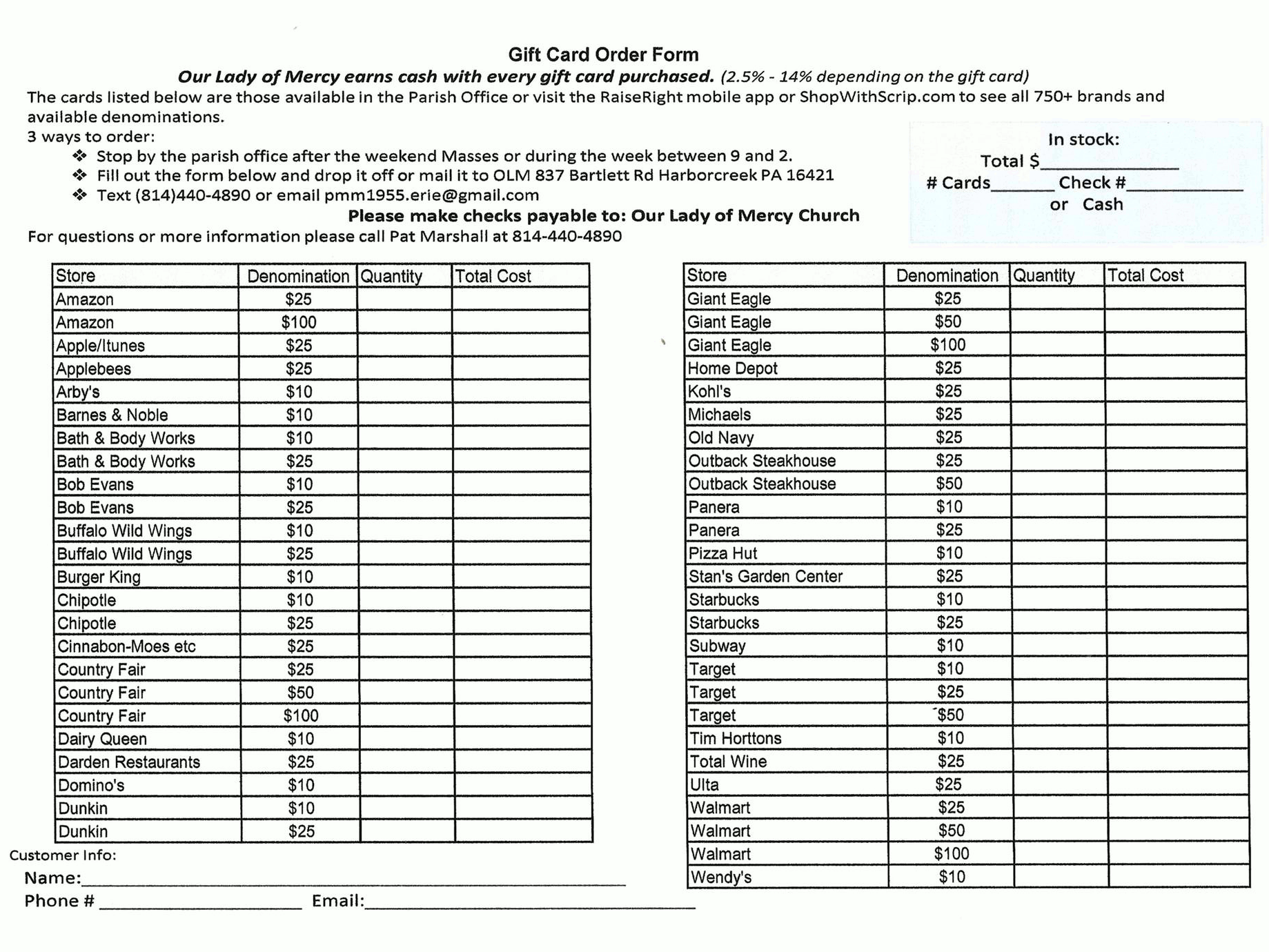 and national retailers provide gift cards to us at a discount, we sell them to parishioners at face value, and the difference is revenue to the parish. You can buy gift cards after each weekend mass or see ordering information below.